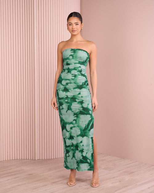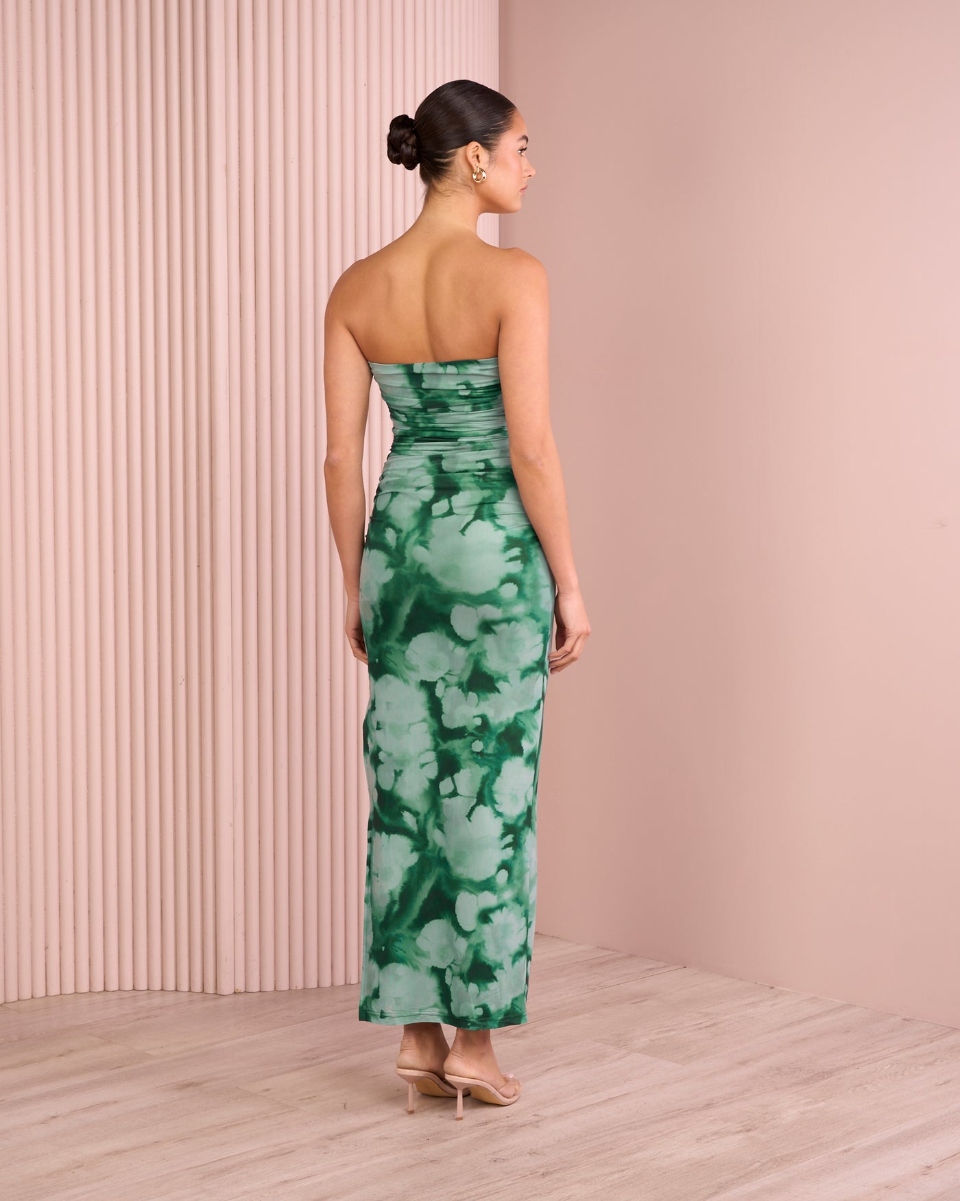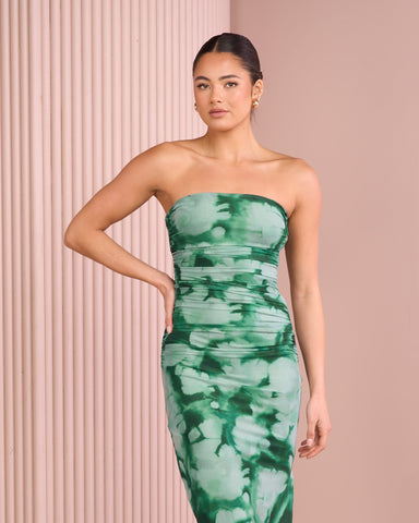 - Ruching throughout bodice