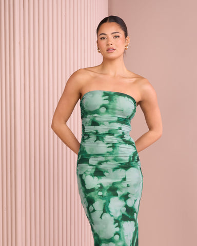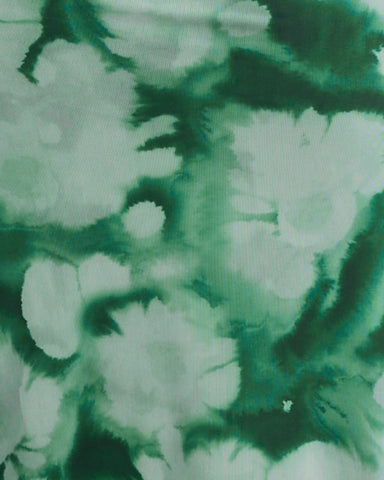 - Printed mesh fabrication in green hues; high stretch