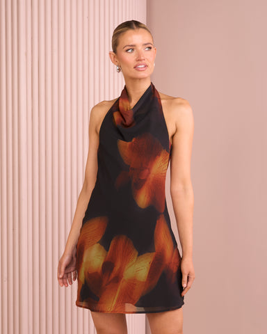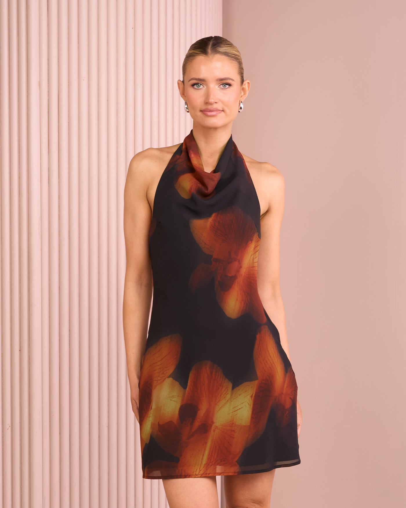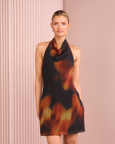 - Lightweight chiffon fabrication; abstract floral print on a black base