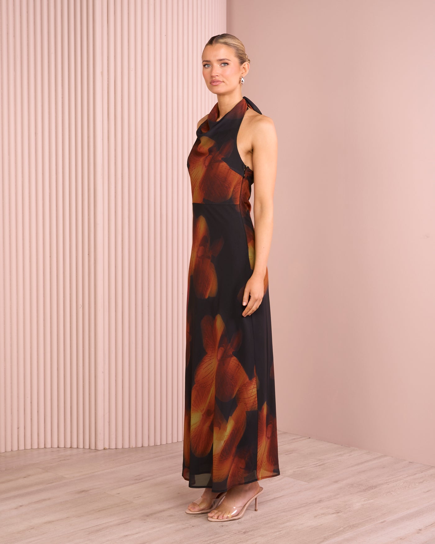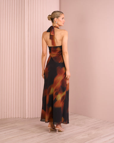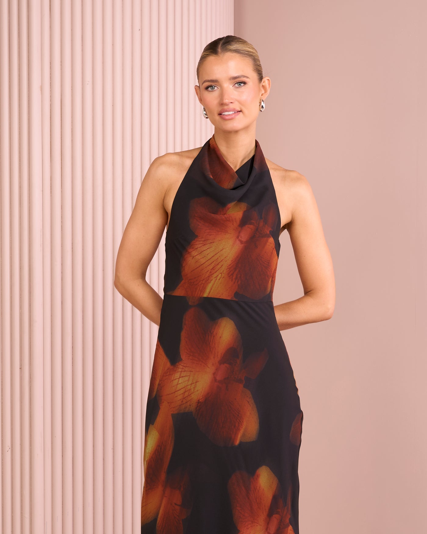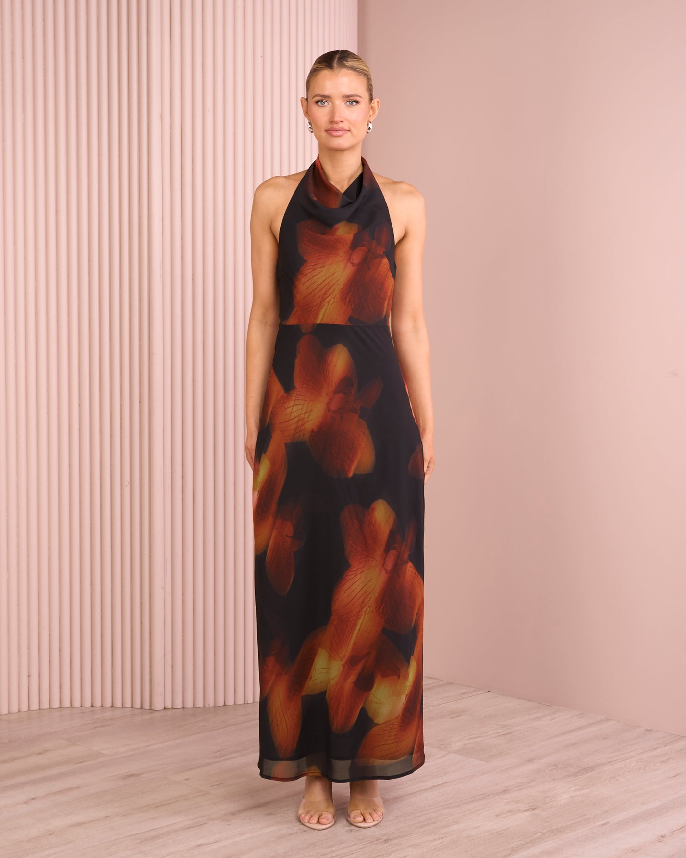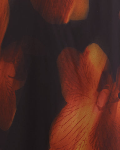 - Lightweight chiffon fabrication; abstract floral print on a black base