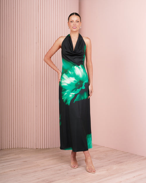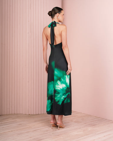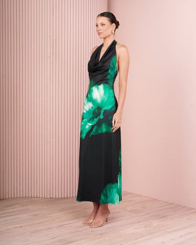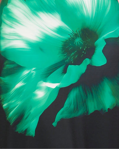 - Luxurious, buttery fabrication; abstract green floral print on a black base