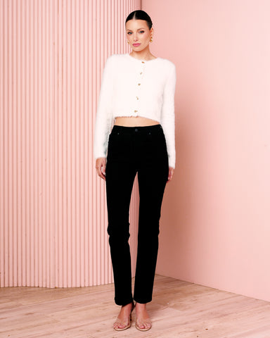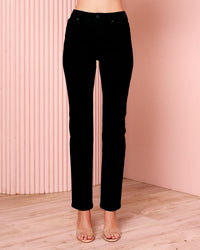 - High-waisted; slim leg design